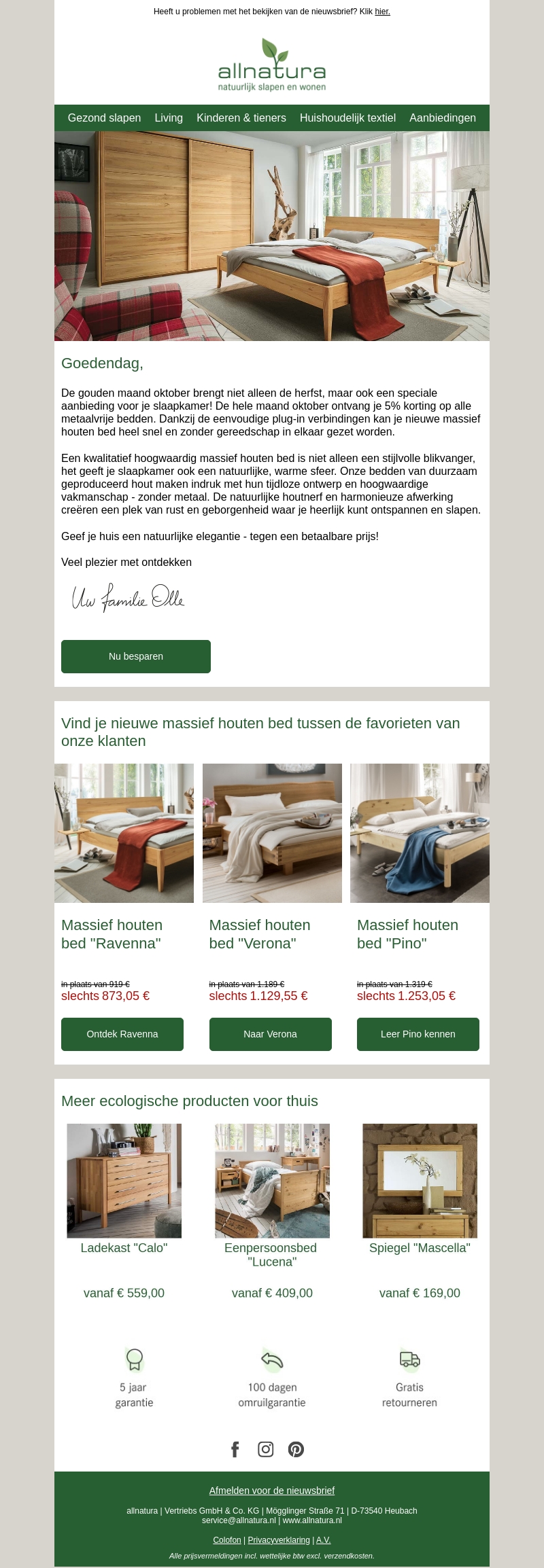De gehele maand oktober biedt een speciale korting van 5% op alle metaalvrije bedden bij Allnatura. Deze stijlvolle en duurzame bedden creëren een natuurlijke, warme sfeer in elke slaapkamer. Ontvang nu jouw metaalvrije massief houten bed en geniet van tijdloze elegantie tegen een betaalbare prijs.