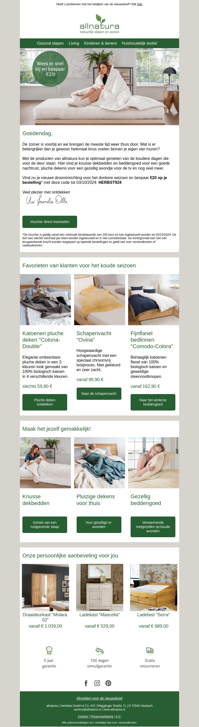De zomer is voorbij en allnatura biedt je de kans om een €20 voucher te verdienen voor je volgende bestelling. Ontdek de beste producten voor de koude seizoenen. Maak je huis gezellig met onze dekbedden, dekens en beddengoed. Gebruik de code HERBST924 bij je aankoop.