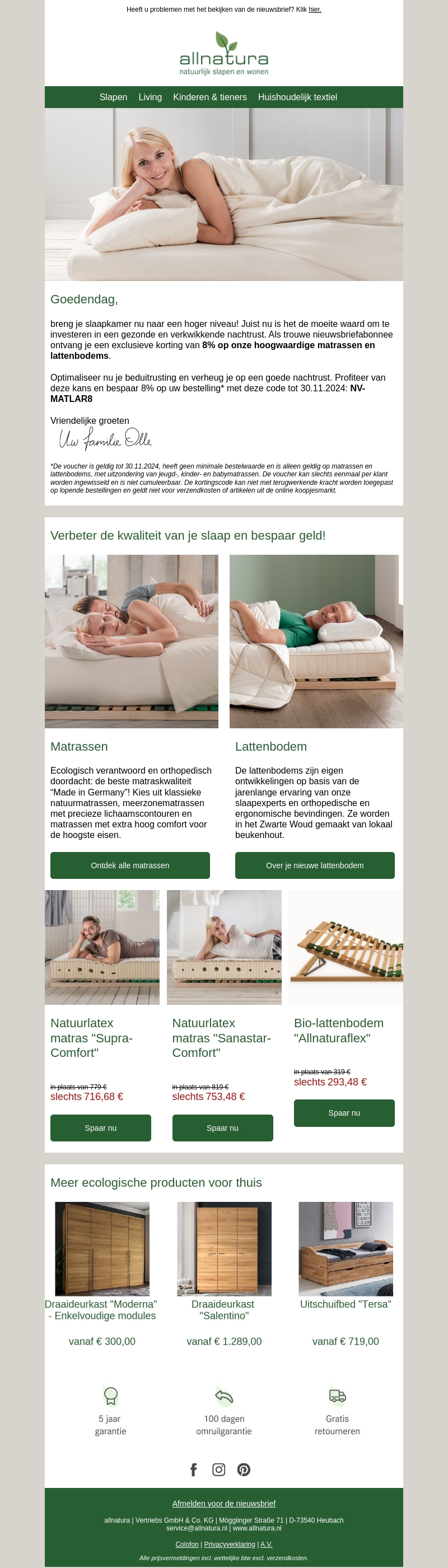 Allnatura biedt een exclusieve korting van 8% op matrassen en lattenbodems voor trouwe nieuwsbriefabonnees. Verbeter uw slaapcomfort met duurzame en ergonomische producten. Actie geldig tot 30.11.2024 met code MATLAR8. Ontdek de voordelen van ecologische en orthopedische slaapsystemen.