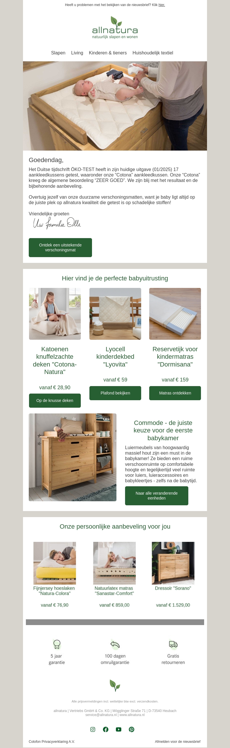 De Cotona verschoningsmat van Allnatura is bekroond met een 'ZEER GOED' beoordeling door het Duitse tijdschrift ÖKO-TEST. Deze matras biedt uw baby een veilige en comfortabele plek, vrij van schadelijke stoffen. Vertrouw op Allnatura’s kwaliteit voor de perfecte baby-uitrusting.