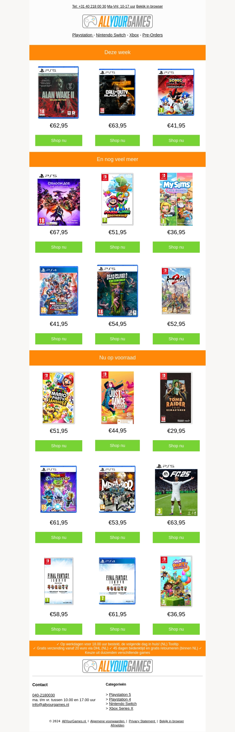 Deze week bij AllYourGames: spannende releases zoals Call of Duty: Black Ops, Alan Wake II en Sonic Shadow. Op zoek naar nog meer games? Bekijk onze uitgebreide selectie met titels als Dragon Age en Mario Party. Profiteer van onze snelle levering bij bestelling voor 18:00 uur!