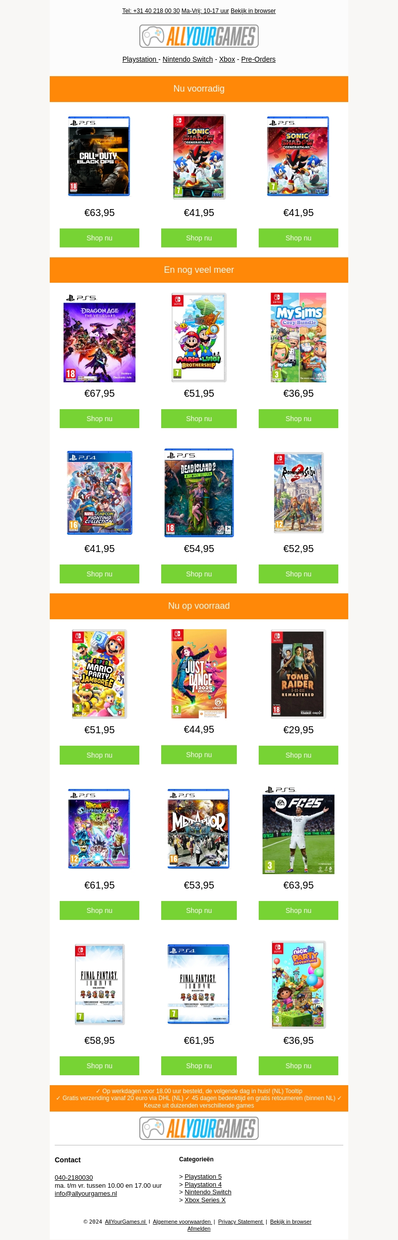 Bekijk de nieuwste aankopen en aanbiedingen bij ALLYOURGAMES. Met spellen zoals Call of Duty: Black Ops 6 en Sonic Shadow hebben we indrukwekkende titels op voorraad. Geniet van razendsnelle levertijden en scherpe prijzen. Ontdek ook andere topgames zoals Dragon Age en Just Dance 2024. Pak deze kans en verrijk je gaming collectie vandaag nog. Voor 18:00 besteld, morgen in huis!