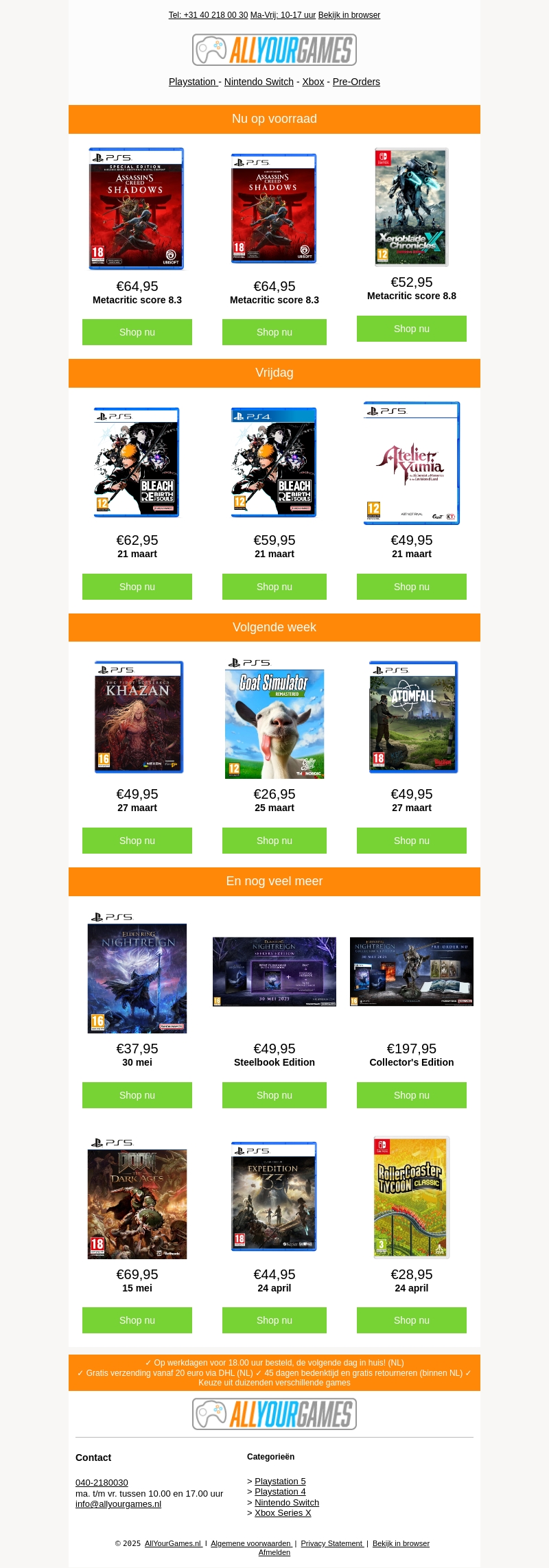 Duik in spannende avonturen met de nieuwste releases zoals Assassin's Creed Shadows en Xenoblade Chronicles X. Beide games zijn nu op voorraad en klaar voor actie! Of je nu een PS5, PS4 of Nintendo Switch hebt, er is iets voor elke gamer.