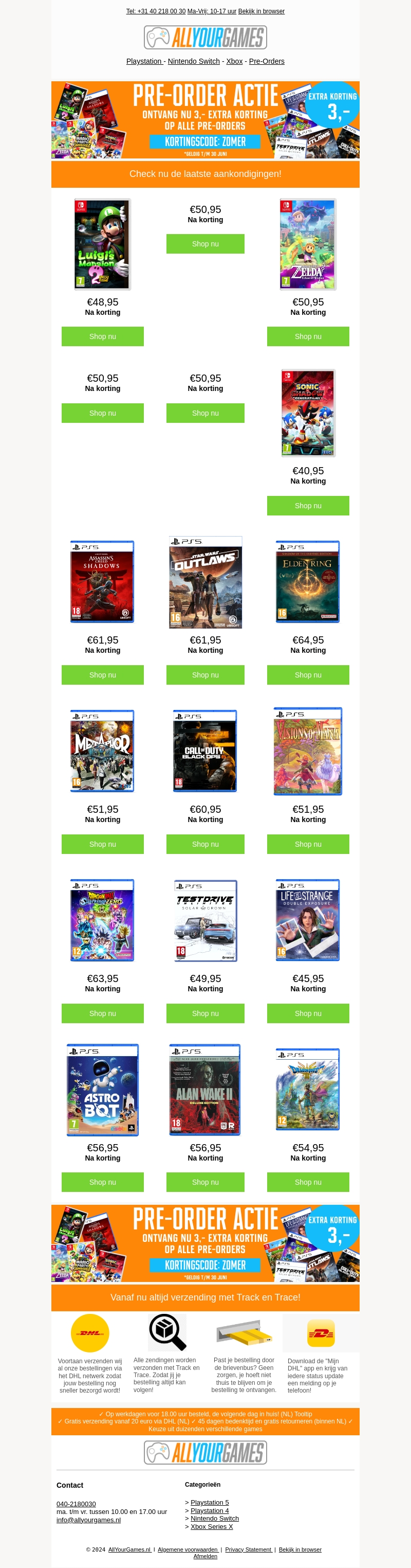 Mis deze geweldige kans niet om extra korting te krijgen op alle pre-orders bij AllYourGames. Met een breed scala aan spellen voor verschillende consoles, is er voor ieder wat wils. Bestellingen boven de €18,00 worden gratis verzonden. Houd je favoriete games in de gaten en bestel ze nu met korting!