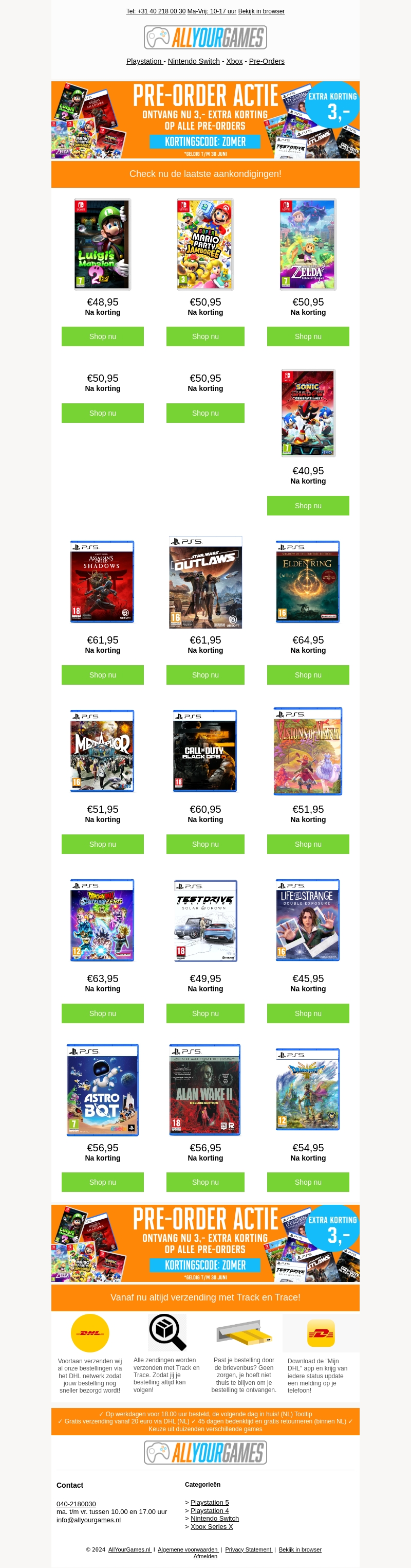 Ontvang nu €3,- extra korting op alle pre-orders bij AllYourGames met kortingscode ZOMER. Bekijk de nieuwste games voor Nintendo Switch, PlayStation, en Xbox. Bestel vandaag nog om van deze aanbieding te profiteren.