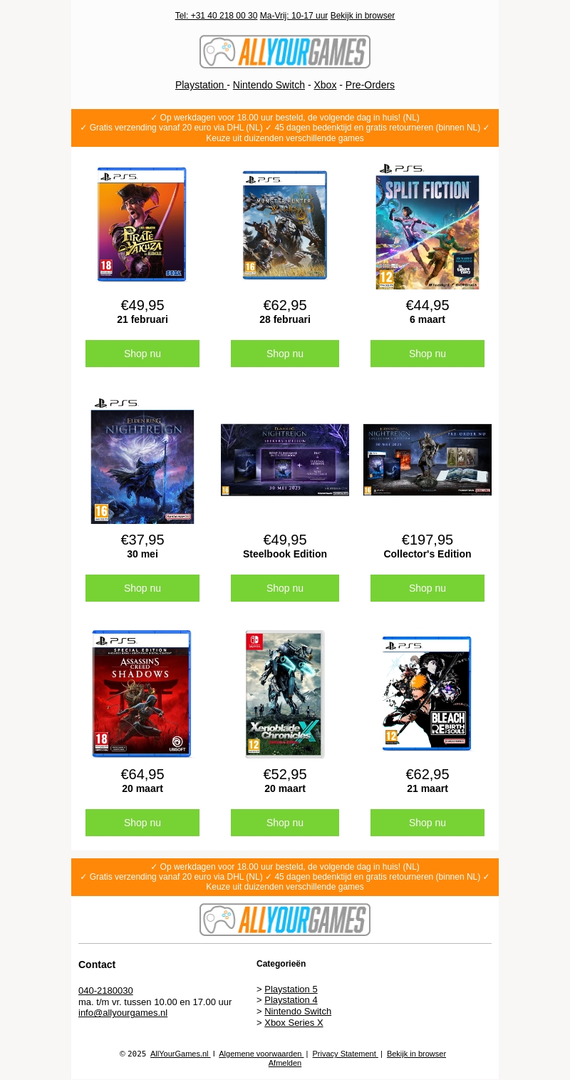 Bekijk de meest opwindende game-releases deze maand bij AllYourGames. Van collector's editions tot speciale edities, mis ze niet! Profiteer van gratis verzending en snelle levering. Bestel voor 18.00 uur en ontvang jouw game de volgende dag. Kies uit een breed scala aan games voor PS5, Xbox, en Nintendo Switch.