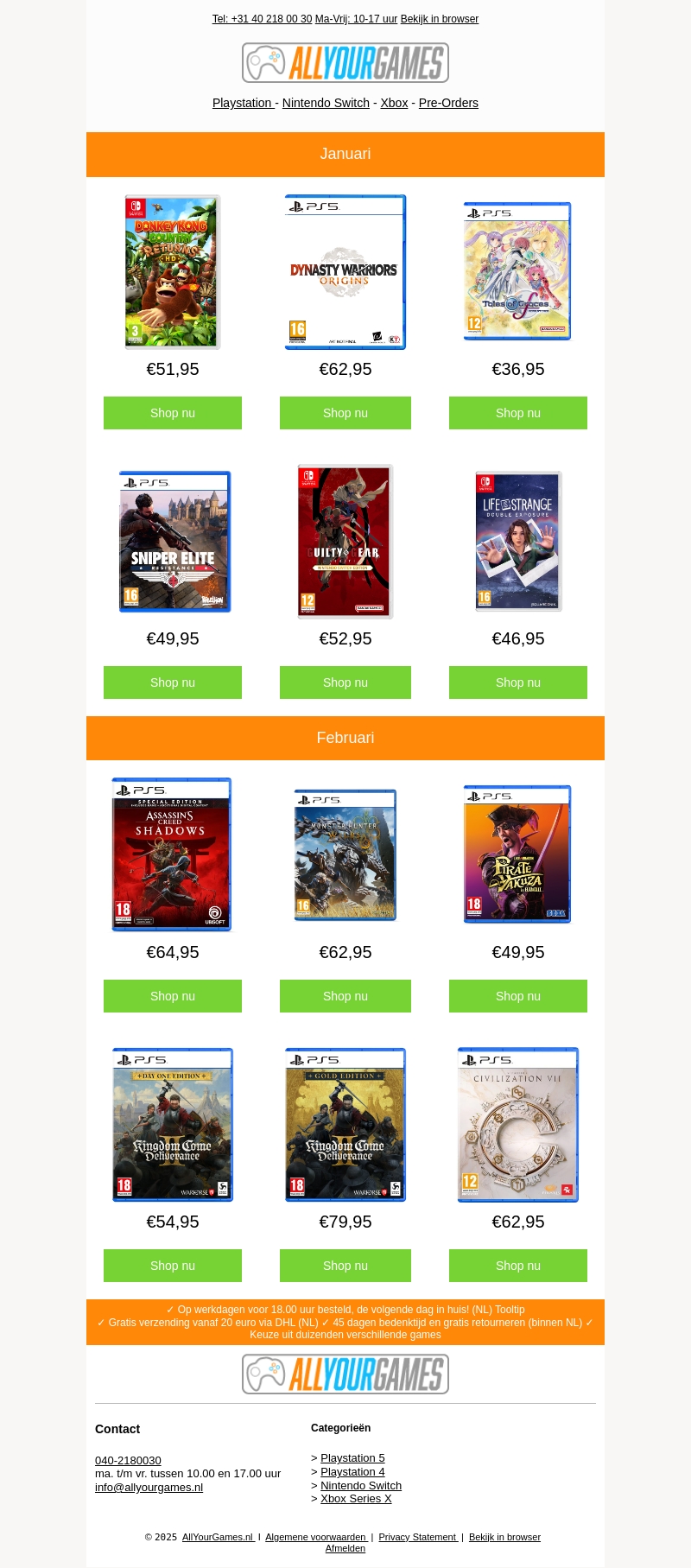Deze maand heeft AllYourGames weer een reeks spannende nieuwe releases voor alle gaming consoles. Of je nu een fan bent van actie, avontuur of strategie, er is voor elk wat wils. Ontdek titels zoals 'Assassin's Creed Shadows' en 'Sniper Elite'. Mis de kans niet om te profiteren van gratis verzending voor bestellingen vanaf €20. Verwen jezelf met de nieuwste hits en begin meteen met spelen. Bezoek onze webshop voor meer details en aantrekkelijke kortingen!