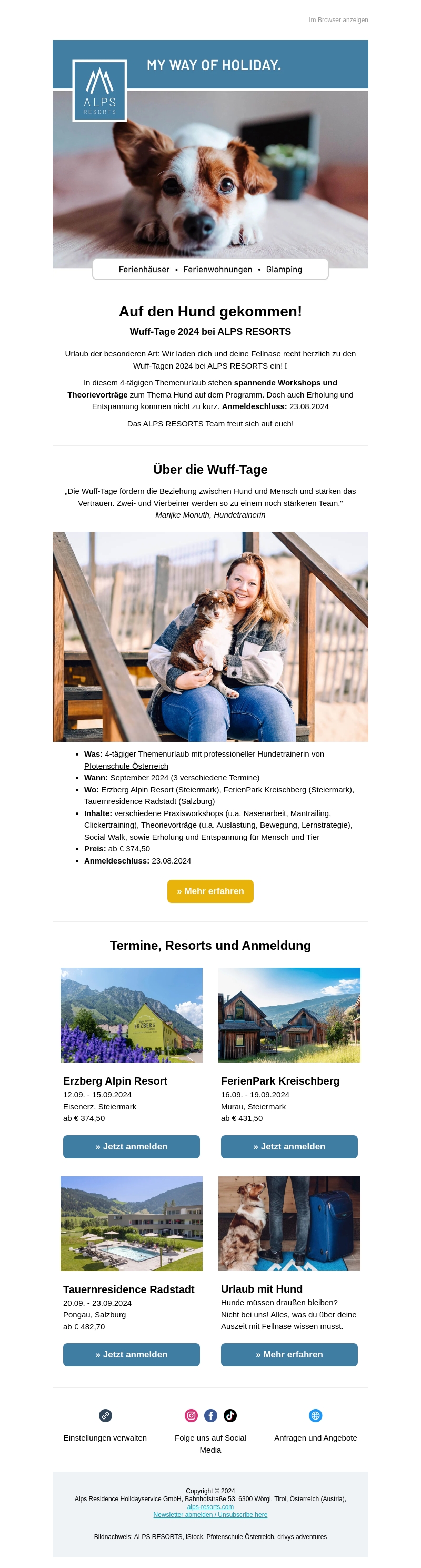 Neem deel aan de unieke Wuff-Tage 2024 bij ALPS RESORTS. Een 4-daagse themavakantie met workshops en lezingen over honden, ontspanning voor baas en huisdier, en professionele hondentraining. Mis deze kans niet en meld je aan voor 23 augustus 2024!