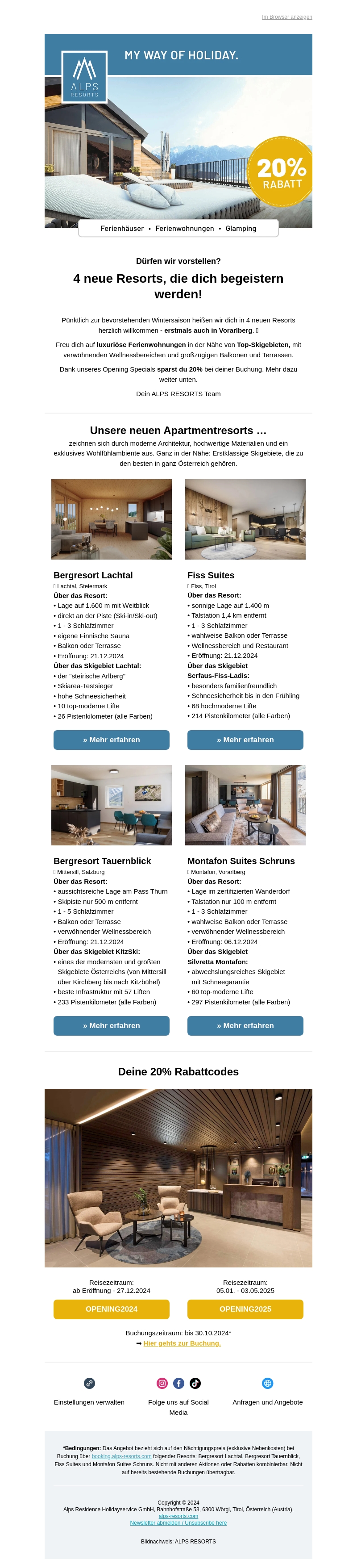 Mis deze kans niet om vier nieuwe resorts te ontdekken die perfect zijn voor je wintervakantie. Met eersteklas skigebieden en luxe accommodaties, bieden deze resorts een verwarmende toevlucht voor elke reiziger. Geniet van ruime terrassen en vernieuwde wellnessruimtes. Boek nu en profiteer van 20% korting met speciale openingscodes. Bereid je voor op een onvergetelijke vakantie-ervaring in Oostenrijk. Wees er snel bij!