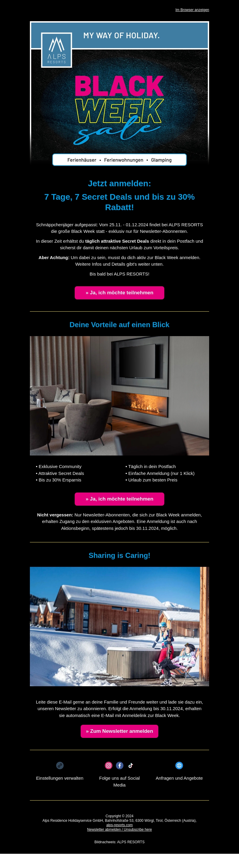 Mis deze exclusieve Black Week-aanbiedingen niet bij ALPS RESORTS! Van 25 november tot 1 december 2024 kun je genieten van geheime deals met tot wel 30% korting. Meld je aan voor onze nieuwsbrief en ontvang dagelijks nieuwe aanbiedingen. Wees snel, want toegang is alleen voor nieuwsbriefabonnees!
