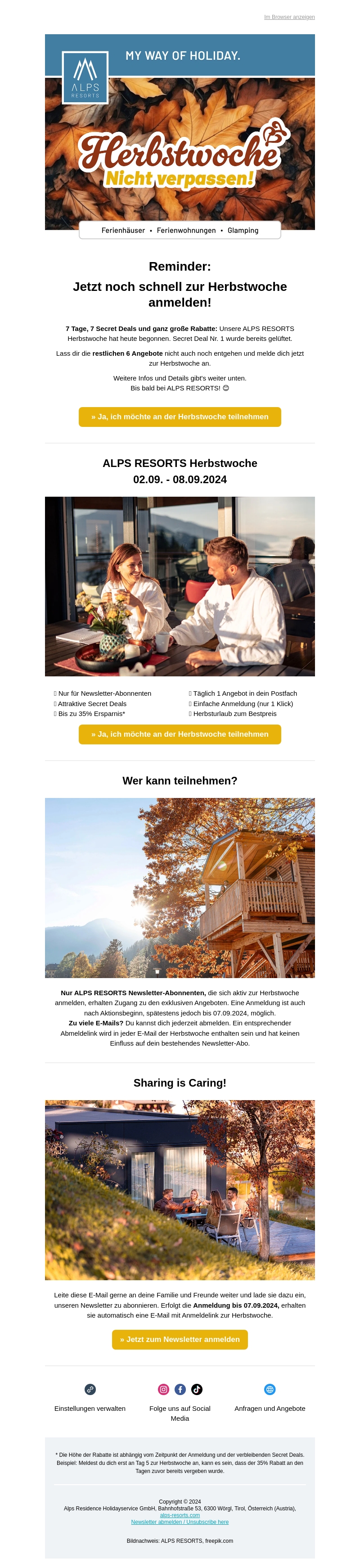 Vergeet niet je aan te melden voor de ALPS RESORTS Herfstweek van 02.09. - 08.09.2024. Profiteer van 7 dagen, 7 secret deals en grote kortingen. Deze aanbieding is exclusief voor nieuwsbriefabonnees. Meld je snel aan en geniet van aantrekkelijk onthulde deals.