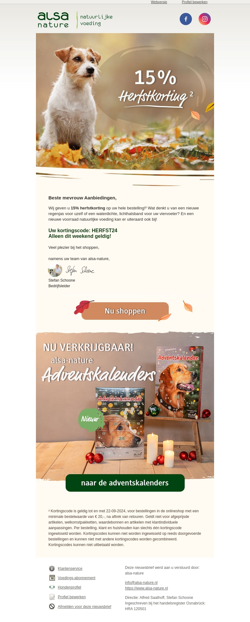 Beste mevrouw Aanbiedingen, wij geven u 15% herfstkorting op uw hele bestelling bij alsa-nature! Gebruik de kortingscode HERFST24 alleen dit weekend geldig. Shop nu en ontdek onze nieuwe producten, inclusief adventskalenders voor uw viervoeter.