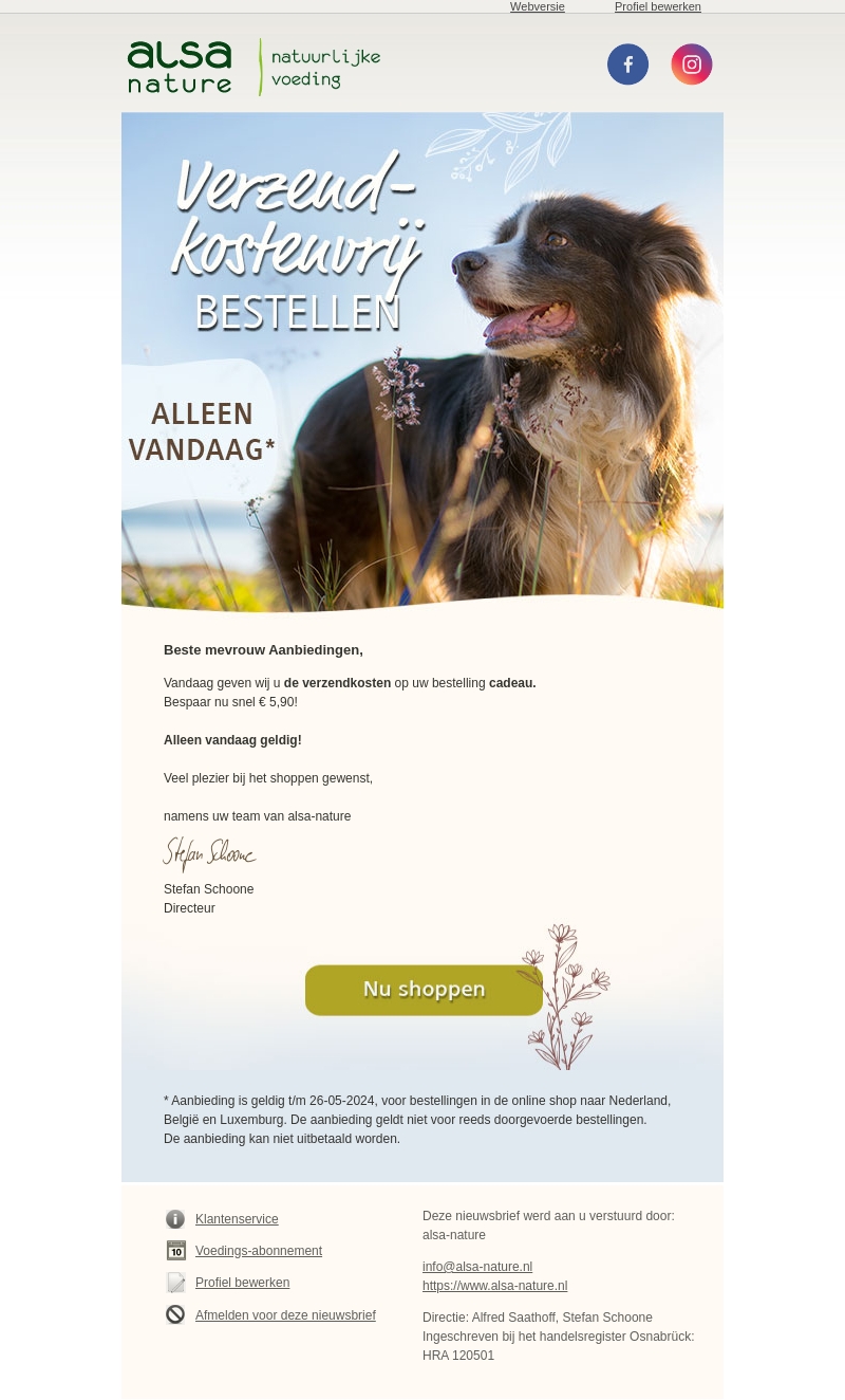 Beste mevrouw Aanbiedingen, ontvang vandaag gratis verzendkosten op uw bestelling bij alsa-nature. Bespaar nu snel €5,90. Alleen vandaag geldig!
