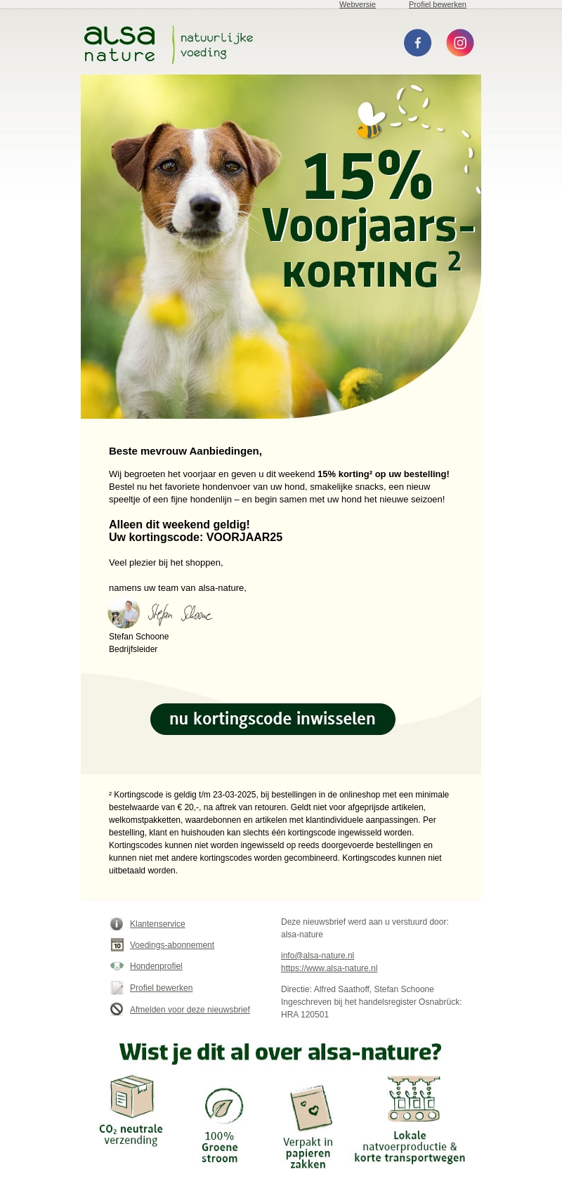 Begin het nieuwe seizoen goed met een speciale 15% voorjaarskorting van alsa-nature. Bestel het favoriete voer, snacks of speeltjes van jouw hond en grijp deze kans om voordelig te shoppen. Deze aanbieding is alleen dit weekend geldig. Gebruik kortingscode VOORJAAR25 bij het afrekenen en geniet van plezierig winkelen bij alsa-nature.