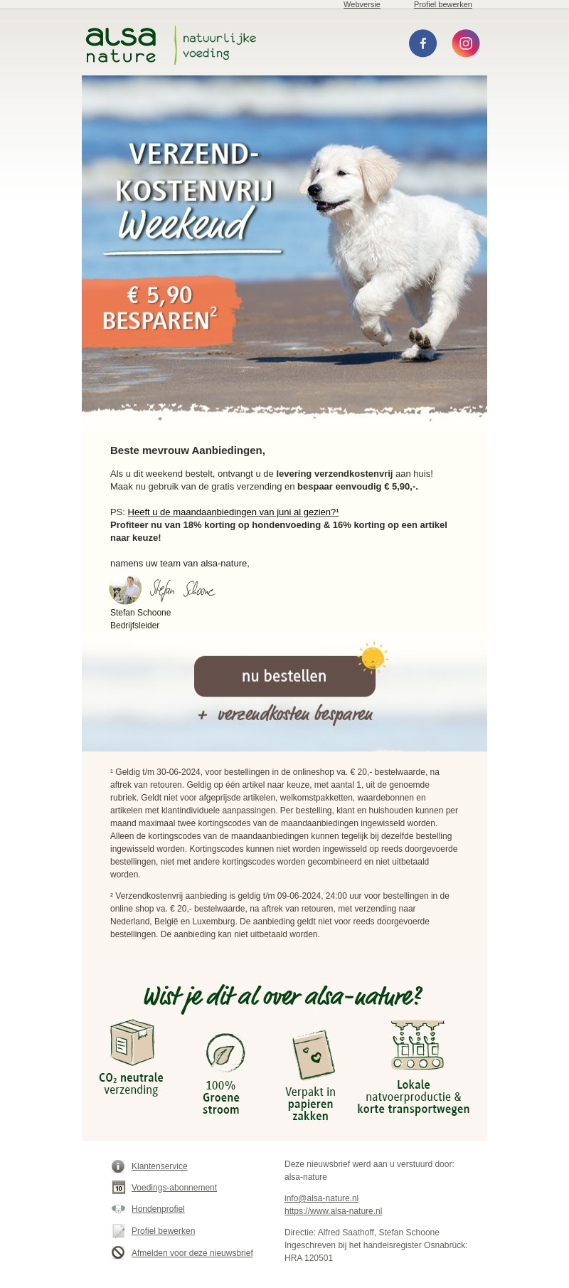 Deze week kunt u profiteren van gratis verzending bij alsa-nature. Bespaar eenvoudig €5,90 op uw bestelling. Ontdek nu ons maandelijkse aanbod en geniet van 18% korting op hondenvoeding en 16% korting op een artikel naar keuze. Mis deze kans niet!