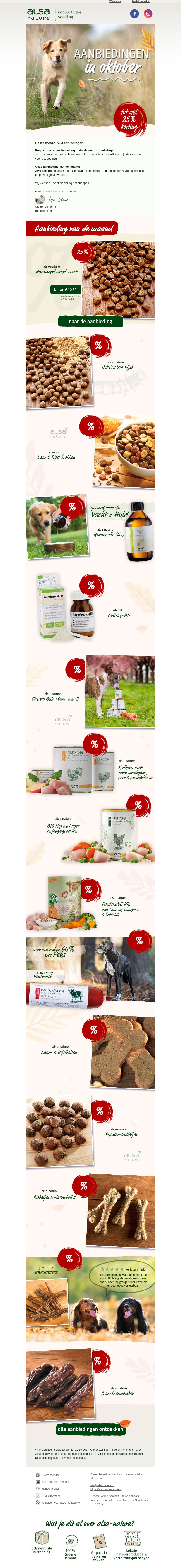 Deze maand biedt Alsa-nature geweldige kortingen aan op een breed assortiment hondenvoeding en snacks. Bespaar tot 25% op geselecteerde producten en zorg dat uw trouwe viervoeter geniet van hoogwaardige voeding. Of u nu op zoek bent naar droogvoer, natvoer, of gezonde snacks, er is voor ieder wat wils. Ontdek de nieuwste aanbiedingen en geef uw hond het beste voor minder. Zorg dat u nu profiteert van deze aanbiedingen en koop voordelig in!