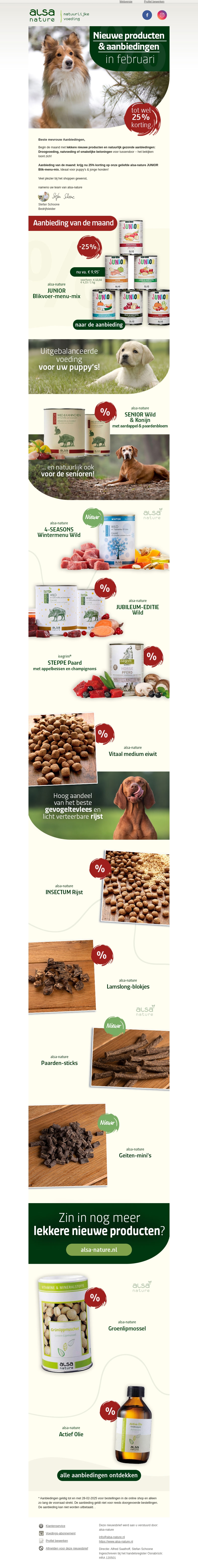 Bezoek onze nieuwsbrief voor februari en ontdek nieuwe producten voor uw hond met aantrekkelijke kortingen tot wel 25%. Of u nu op zoek bent naar voeding voor puppy's, seniorenhonden, of speciale dieetopties, wij hebben het voor u. Profiteer van onze maandelijkse aanbiedingen en bekijk onze exclusieve selectie. Ga voor gezonde en uitgebalanceerde voeding die perfect past bij de behoeften van uw trouwe viervoeter. Mis geen kans om uw hond het beste te bieden.