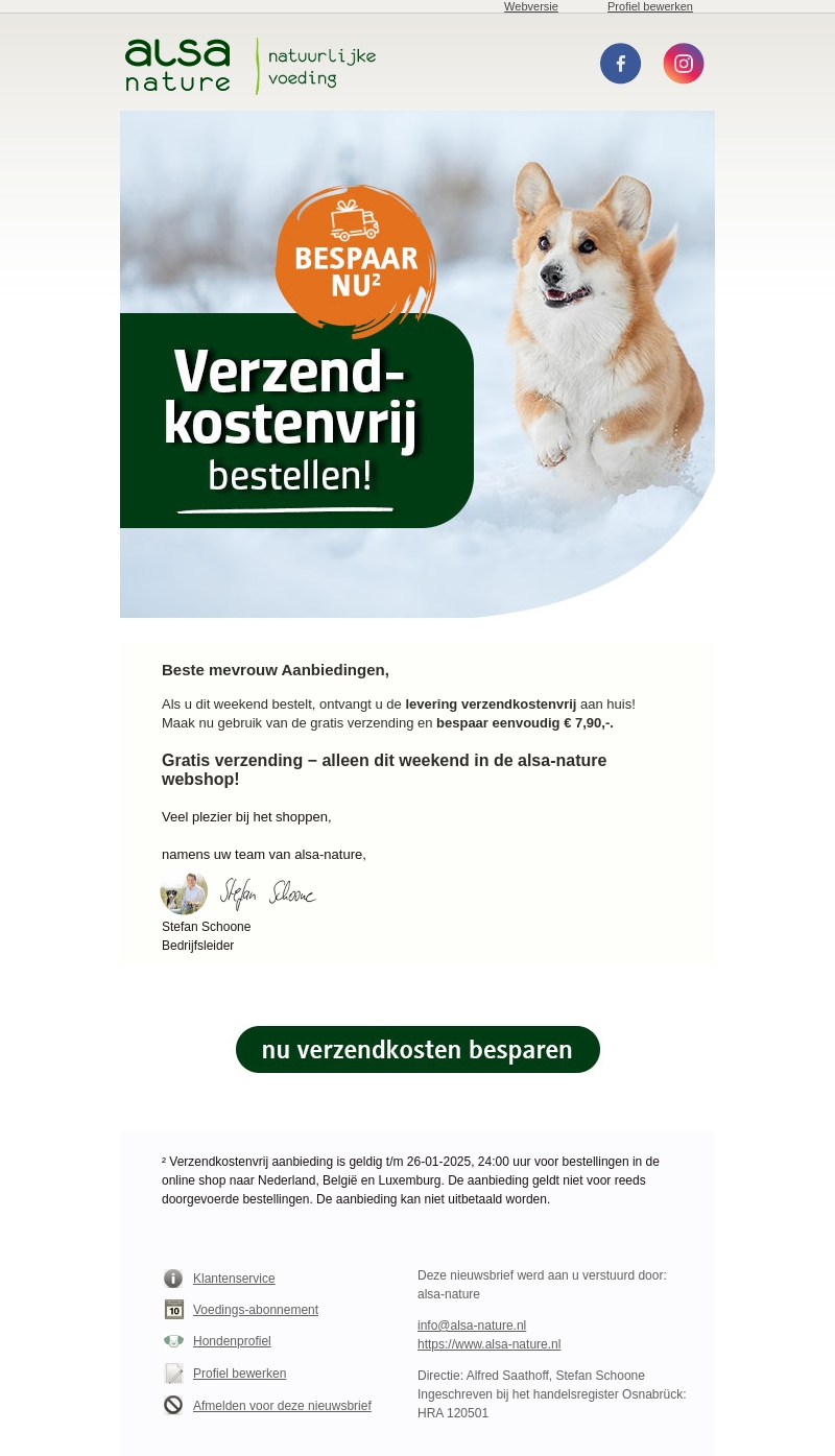 Dit weekend biedt alsa-nature gratis verzending aan voor al uw aankopen. Profiteer van deze unieke kans om €7,90 te besparen op uw bestelling. De aanbieding is geldig t/m 26-01-2025. Haal het beste natuurlijke hondenvoer in huis zonder verzendkosten. Bezoek onze webshop en winkel nu voordelig. Veel shopplezier bij alsa-nature!