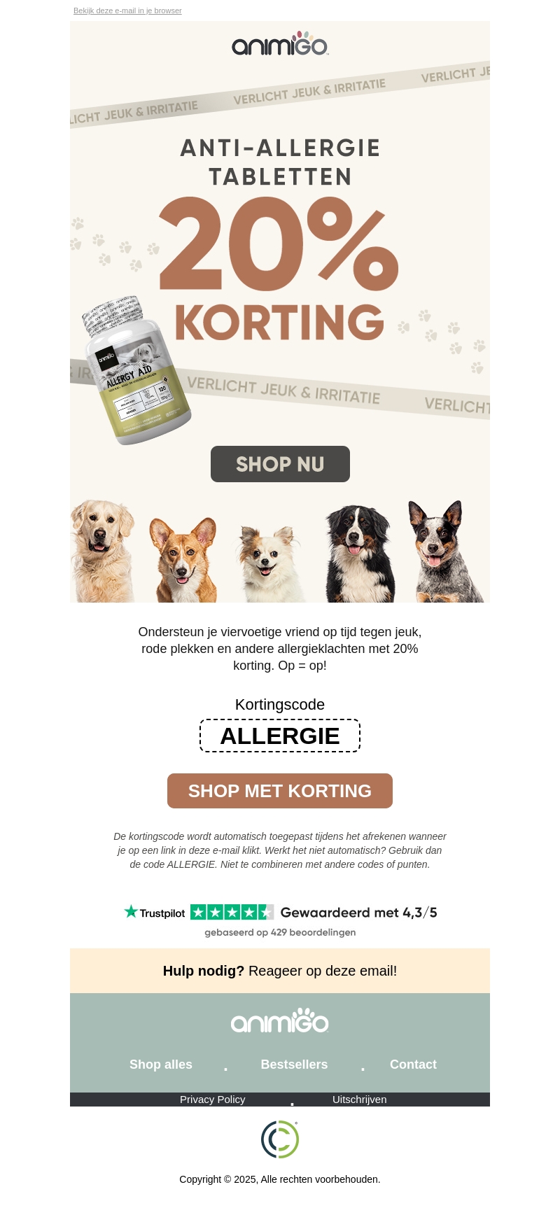 Ondersteun je huisdier met Animigo Anti-Allergie Tabletten en bespaar nu 20% op je aankoop. Deze tabletten helpen je trouwe viervoeter tegen jeuk en irritaties, zodat ze zich beter voelen. De aanbieding geldt zolang de voorraad strekt. Mis deze kans niet en gebruik de kortingscode voor extra voordeel. Shop nu en verzorg je huisdier optimaal.