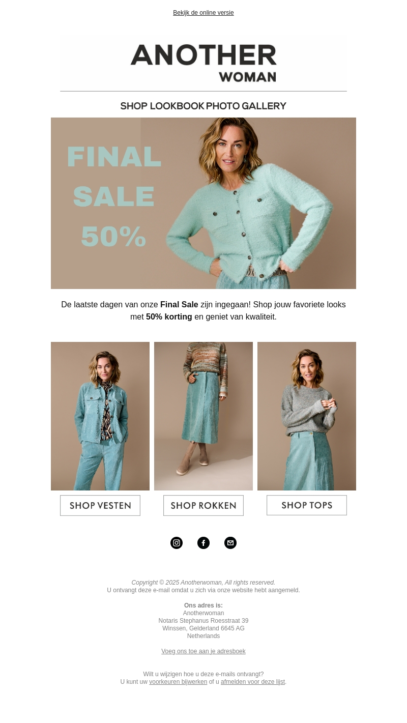 De laatste dagen van de Final Sale bij Anotherwoman zijn aangebroken! Grijp je kans en shop je favoriete looks met 50% korting. Mis deze unieke kans niet om je garderobe bij te werken met kwaliteitskleding. Van vesten tot rokken en tops, er is voor ieder wat wils. Geniet van stijlvolle outfits en een aantrekkelijke korting. Bezoek nu de online winkel en ontdek de volledige collectie.