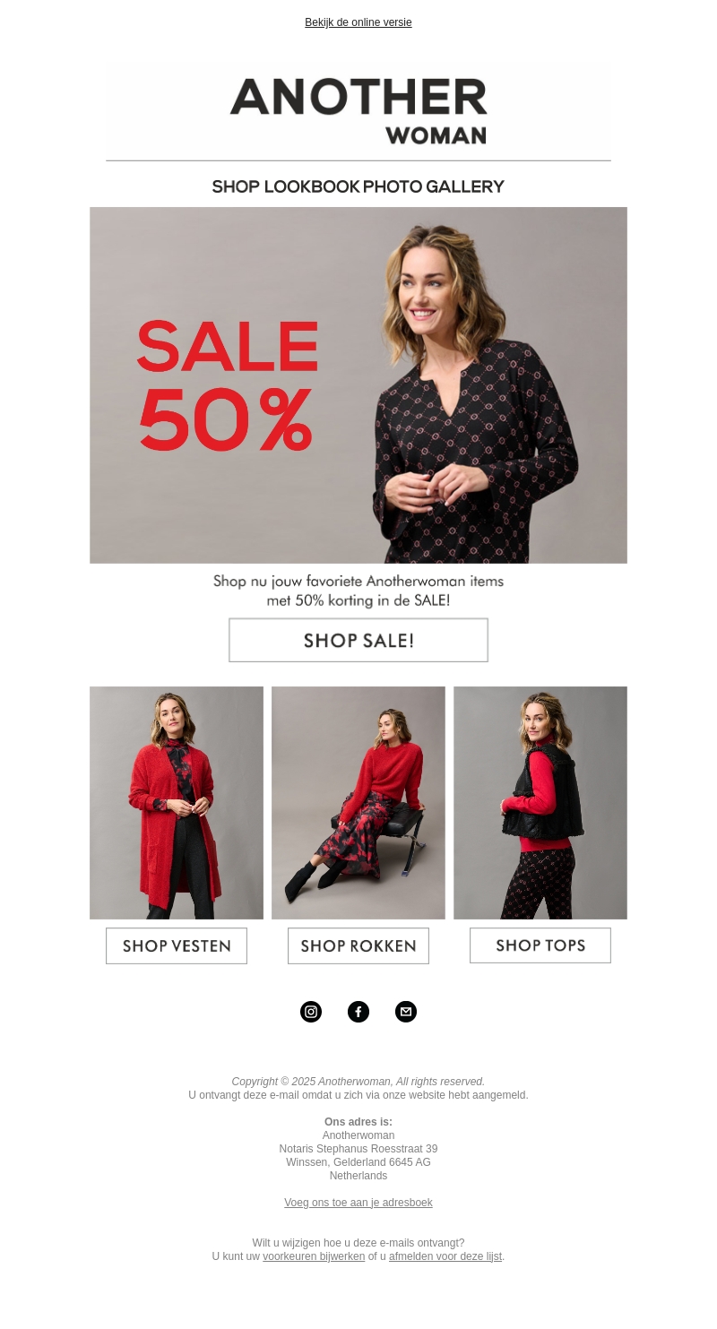 Beleef de ultieme winkelervaring met 50% korting op topmerken zoals Anotherwoman. Verwen jezelf met de nieuwste vesten, rokken en tops uit onze trendy collectie. Mis deze unieke kans niet om te shoppen met ongekende kortingen, alleen gedurende de SALE. Blader door onze Lookbook Photo Gallery voor inspiratie en laat je verrassen door de prachtige ontwerpen. Verfris je garderobe met stijlvolle keuzes en stap zelfverzekerd de deur uit.