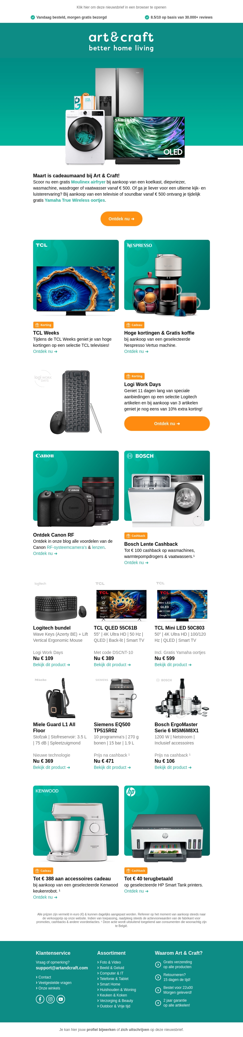 Maart is cadeaumaand bij Art & Craft! Ontvang een gratis Moulinex airfryer bij aankoop van een koelkasten, diepvriezer, wasmachine of vaatwasser vanaf € 500. Bekijk ook speciale aanbiedingen van merken zoals TCL en Nespresso. Mis de kans niet om een Logitech-product te kopen met extra korting. Geniet van extra cashback op geselecteerde Bosch en HP producten.