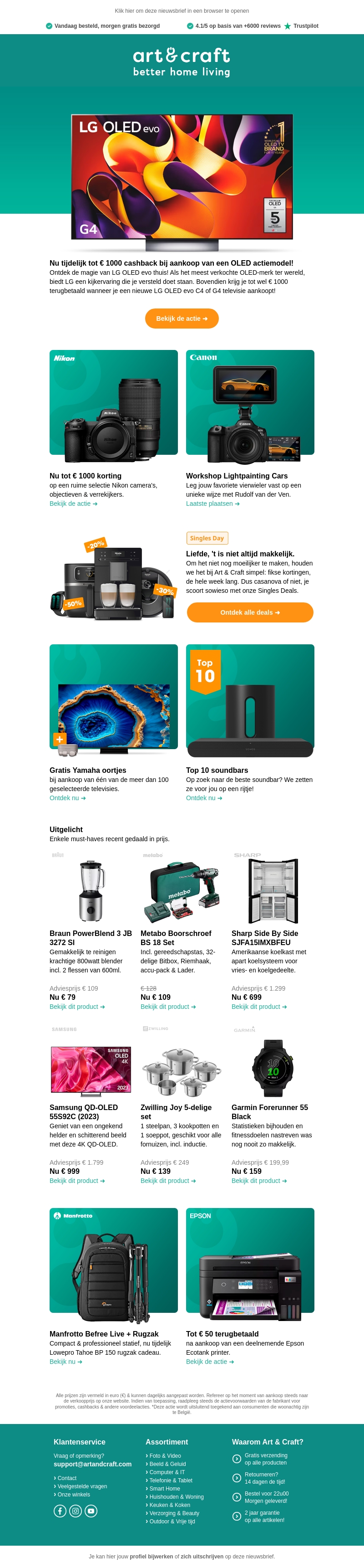 Singles Day staat voor de deur en dat betekent hoge kortingen bij Art & Craft. Profiteer van β¬1000 cashback bij aankoop van een LG OLED TV. Ontdek onze selectie top 10 soundbars en de nieuwste Nikon camera's met korting. Mis deze kans niet om je favoriete producten tegen gereduceerde prijzen te scoren.