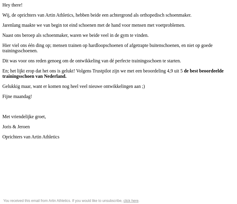 De oprichters van Artin Athletics, met hun achtergrond als orthopedisch schoenmakers, hebben de hoogst beoordeelde trainingsschoen van Nederland gemaakt. Met een beoordeling van 4.9 op Trustpilot, weten ze zeker dat hun schoenen perfect zijn voor elke workout. Lees meer over hun verhaal en toekomstige ontwikkelingen.