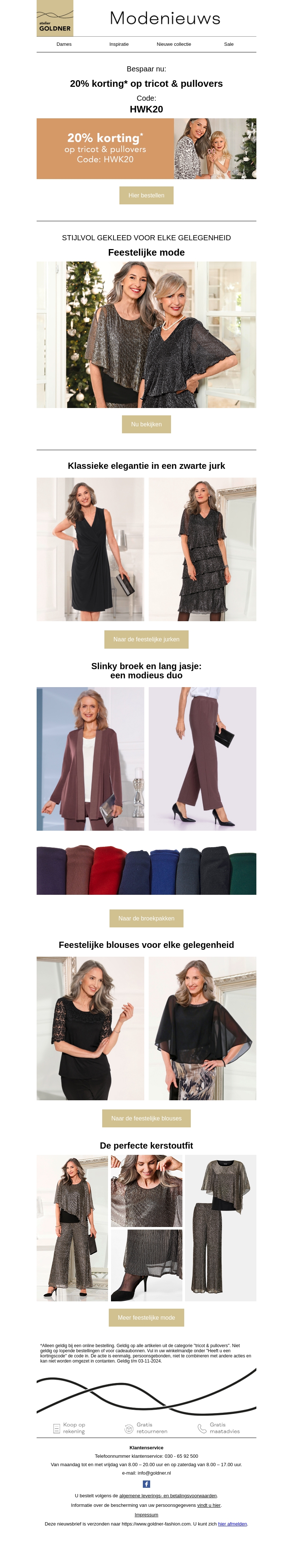 Deze nieuwsbrief van Goldner presenteert feestelijke mode-ideeën voor de feestdagen. Profiteer van 20% korting op tricot & pullovers met de code HWK20. Ontdek stijlvolle outfits, van klassieke zwarte jurken tot feestelijke blouses, passend bij elke gelegenheid. Of je nu een rustige familiebijeenkomst hebt of een glamoureuze kerstfeest, Goldner heeft de perfecte outfit voor jou. Shop de nieuwste trends en zorg dat je stijlvol gekleed bent voor de feestdagen.