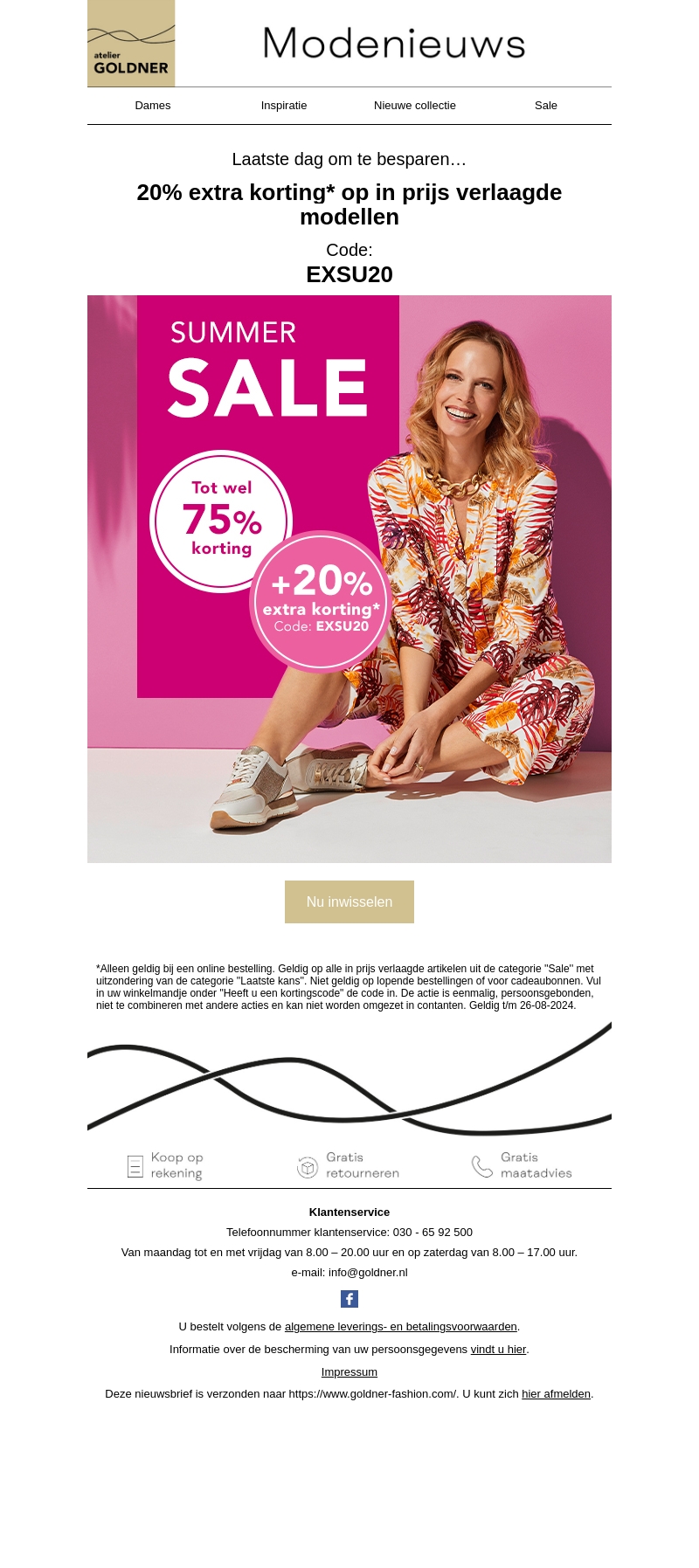 Vandaag is de laatste dag om te profiteren van een extra 20% korting op afgeprijsde modellen bij Atelier GOLDNER. Gebruik de code EXSU20 tijdens het afrekenen. Haast je en bespaar nog meer op je favoriete zomercollectie!