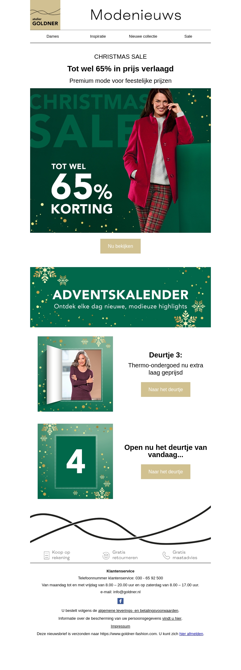 De kerstuitverkoop van Atelier Goldner begint vandaag met kortingen tot wel 65%! Ontdek onze premium mode tegen feestelijke prijzen en verras jezelf of een geliefde met stijlvol thermisch ondergoed, nu extra laag geprijsd. Mis deze geweldige deals niet en duik in ons adventskalender aanbod voor dagelijkse modehoogtepunten.