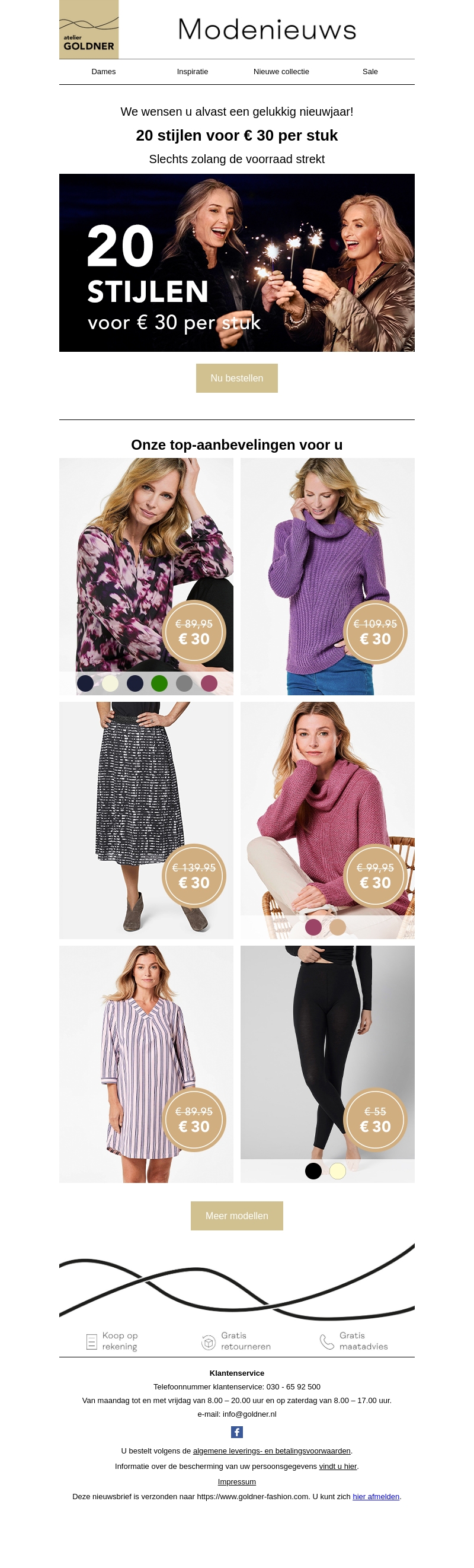 We wensen u alvast een gelukkig nieuwjaar met fantastische modedeals. Ontdek 20 stijlvolle artikelen voor slechts €30 per stuk zolang de voorraad strekt. Bekijk onze top-aanbevelingen en bestel uw favorieten nog vandaag. Geniet van gratis retourneren en koop vandaag op rekening bij Atelier Goldner. Mis deze kans niet om uw garderobe te updaten voor het nieuwe jaar!