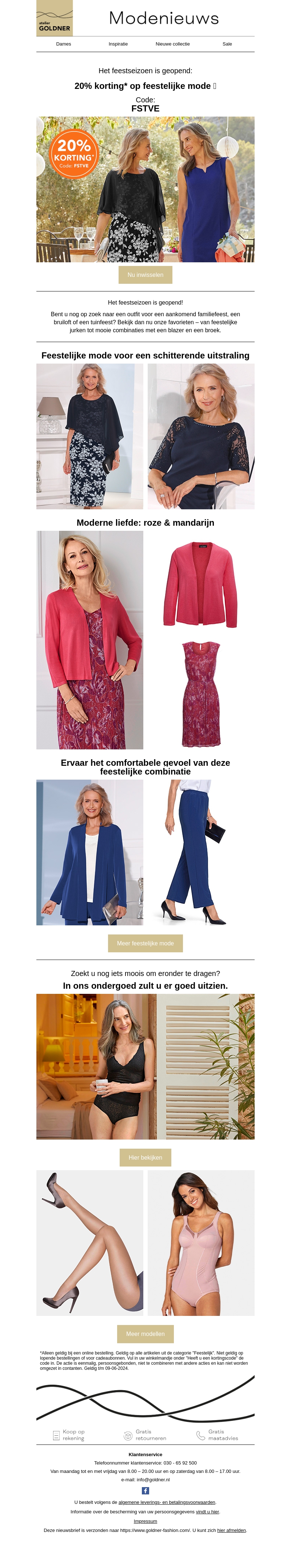 Het feestseizoen is geopend! Ontvang 20% korting op feestelijke mode met de code FSTVE. Verken onze nieuwste outfits voor elk familiefeest, bruiloft of etentje. Moderne trends zoals roze en mandarijn kleuren zijn nu beschikbaar. Bekijk ook onze comfortabele ondermode.