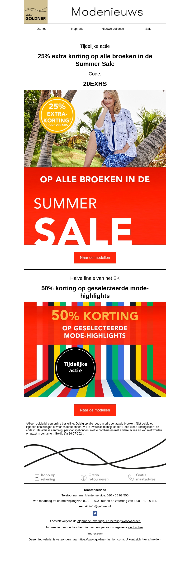 Profiteer nu van 25% extra korting op alle broeken tijdens onze exclusieve Summer Sale! Gebruik de code 20EXHS om de korting te ontvangen. Bovendien hebben we tijdelijke 50% korting op geselecteerde mode-highlights. Deze actie is geldig t/m 16-07-2024.