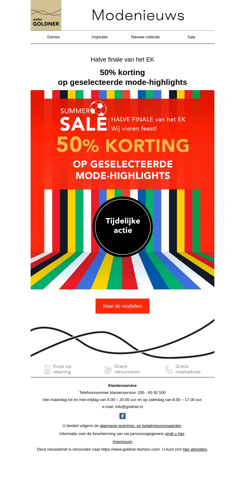 Geniet van een spectaculaire halve finale van het EK met een zomerse uitverkoop. Deze nieuwsbrief biedt u een exclusieve 50% korting op geselecteerde mode-highlights. Mis deze tijdelijke actie niet en breid uw garderobe uit met stijlvolle mode-items.