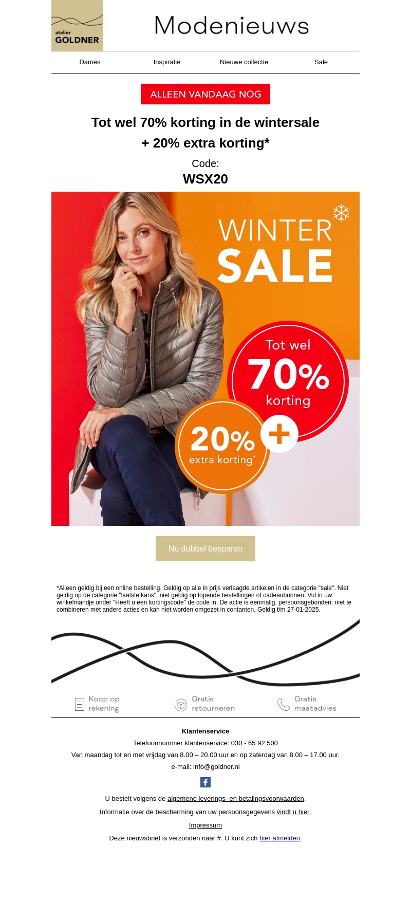 Profiteer vandaag van de exclusieve aanbieding met tot wel 70% korting tijdens de wintersale. Ontdek stijlvolle mode met extra 20% korting met de code WSX20. Wees er snel bij, deze actie is alleen vandaag geldig.