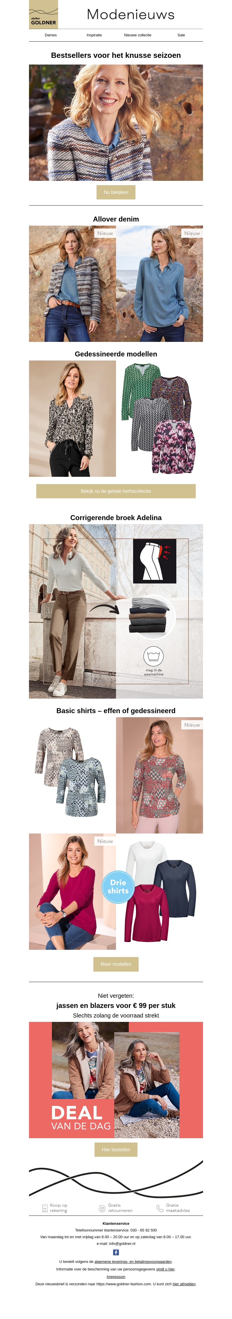 De nieuwste collectie is binnen! Van comfortabele denim outfits tot corrigerende broeken en trendy shirts. Mis ook de Deal van de Dag niet: jassen en blazers voor slechts € 99 per stuk.