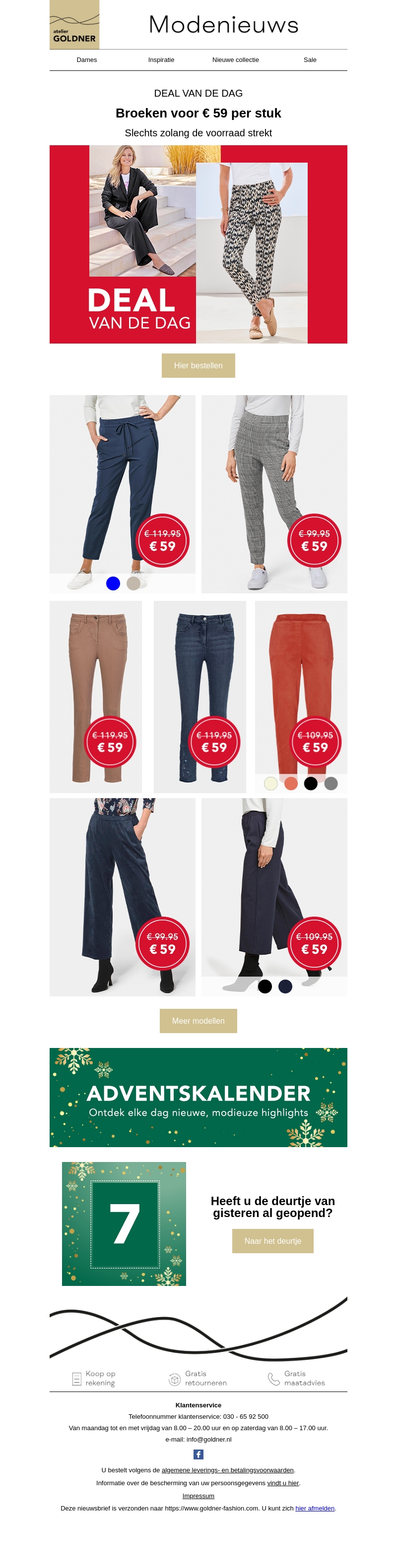 Mis de Deal van de Dag niet! Broeken zijn nu verkrijgbaar voor slechts € 59 per stuk. Kies uit diverse stijlen en kleuren. Wees er snel bij, want op=op. Perfect voor een stijlvolle upgrade van je garderobe. Ontdek ook onze adventskalender voor dagelijks modenieuws.