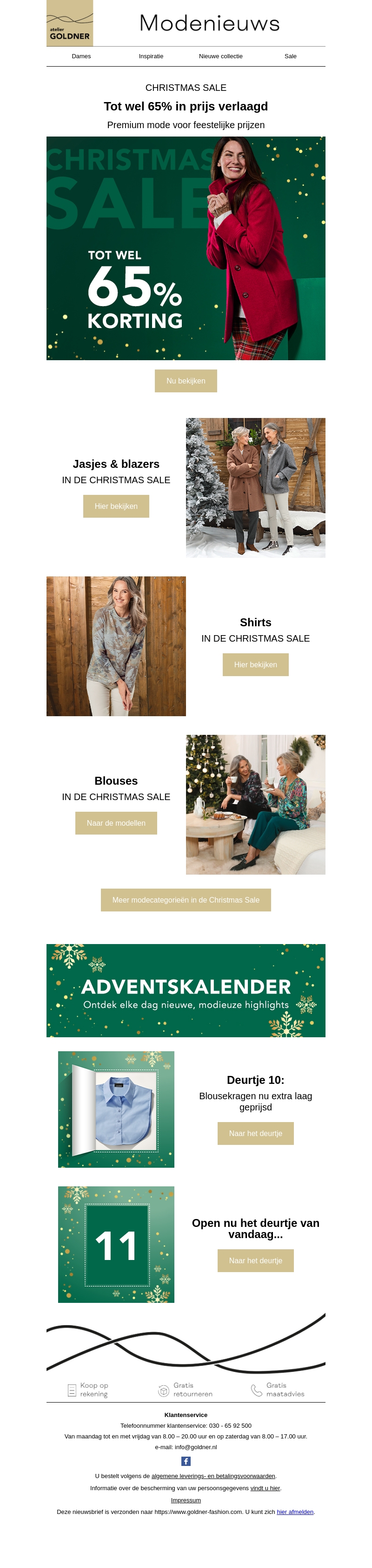 Geniet van de beste kerstdeals bij Atelier Goldner, met kortingen tot wel 65% op premium mode. Ontdek stijlvolle jasjes, blazers, shirts, en blouses speciaal voor de feestdagen. Elke dag wachten er nieuwe verrassingen met onze adventskalender. Mis deze unieke kans niet om modieus het jaar af te sluiten.