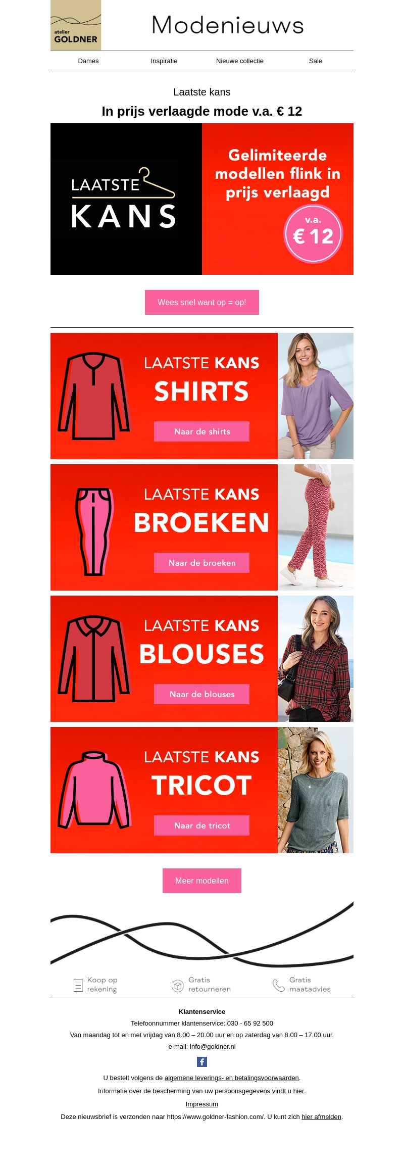 Profiteer van de laatste kans om gelimiteerde modellen te kopen die flink in prijs zijn verlaagd. Mode vanaf slechts €12! Ontdek afgeprijsde shirts, broeken, blouses en tricot. Wees snel, want op = op!