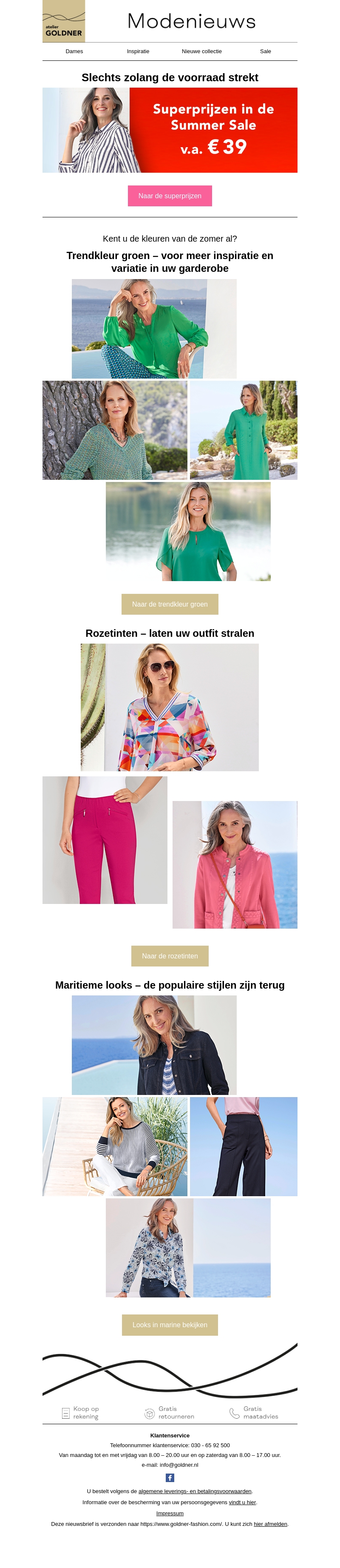 Ontdek de trendkleuren van deze zomer met Atelier Goldner! Van inspirerend groen tot stralende rozetinten en tijdloze maritieme stijlen. Mis de Summer Sale niet met superprijzen vanaf €39. Verrijk je garderobe met de nieuwste modekleuren.