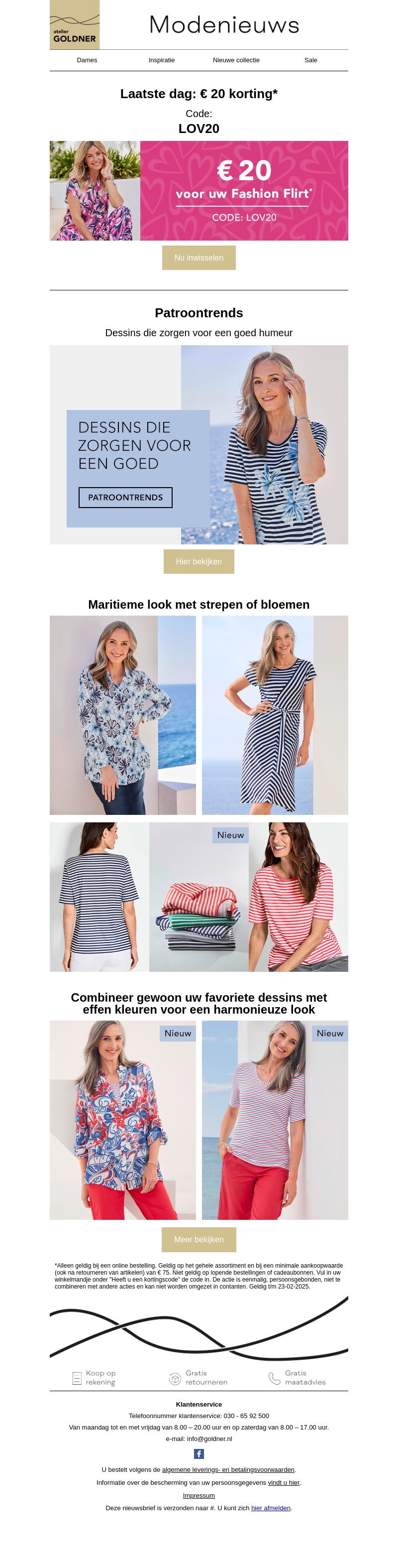 In deze nieuwsbrief vind je modetrends met vrolijke patronen die je look opfleuren. Ontdek de maritieme stijl met strepen en bloemen voor een frisse uitstraling. Combineer je favoriete dessins met effen kleuren voor een harmonieuze en unieke stijl deze zomer.