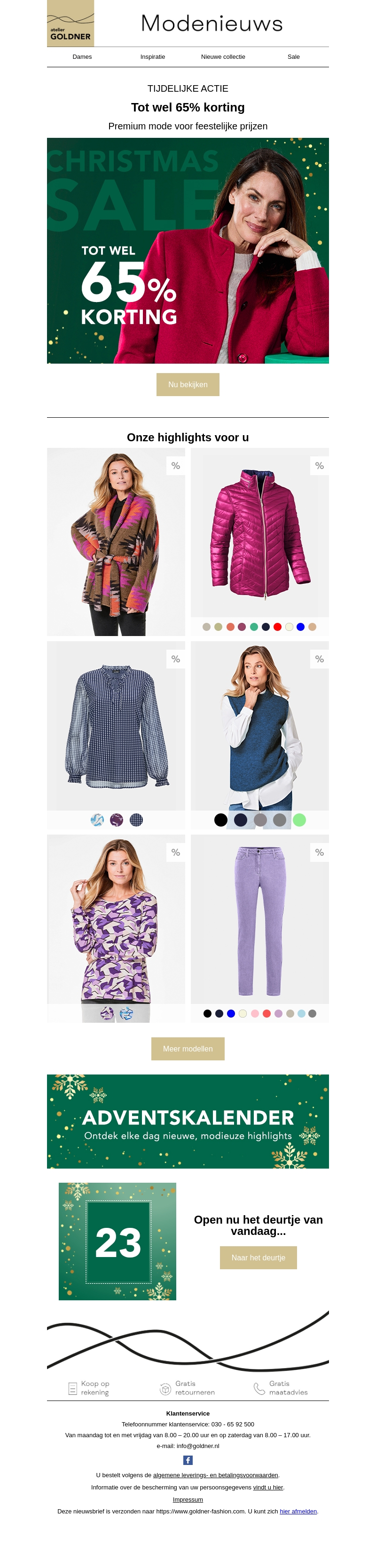 Atelier Goldner presenteert een spectaculaire kerst uitverkoop met kortingen tot wel 65%. Ontdek mode van premium kwaliteit tegen feestelijke prijzen. Verken onze highlights, van stijlvolle jassen tot modieuze blouses. Laat u inspireren door onze adventskalender en vind elke dag nieuwe mode items. Deze aanbieding is slechts tijdelijk geldig.