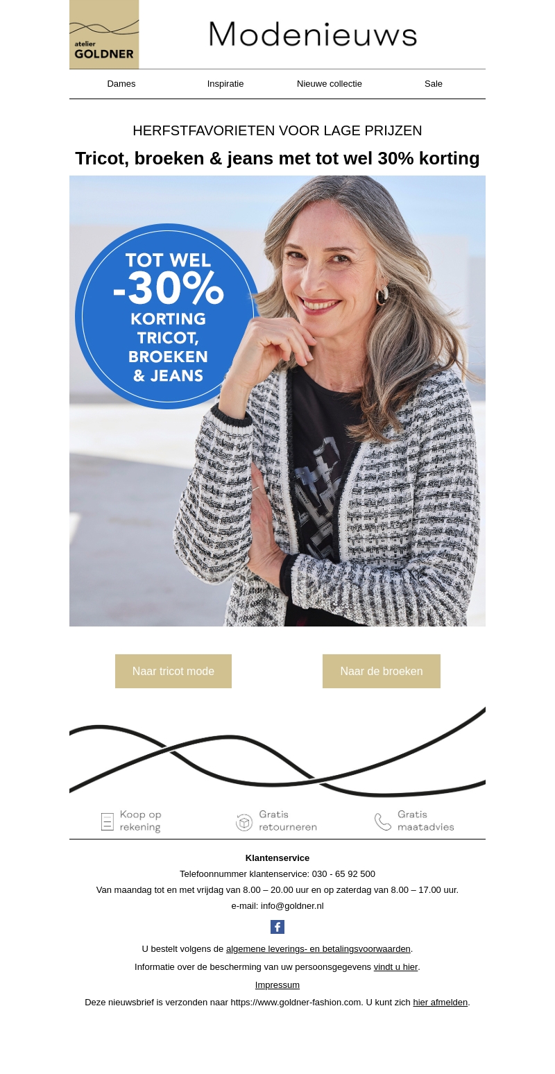 Bekijk nu de herfstfavorieten voor lage prijzen bij Atelier Goldner. Krijg tot wel 30% korting op tricot, broeken en jeans. Dit is het ideale moment om uw garderobe te vernieuwen met stijlvolle en comfortabele mode. Wacht niet te lang, de actie geldt zolang de voorraad strekt.