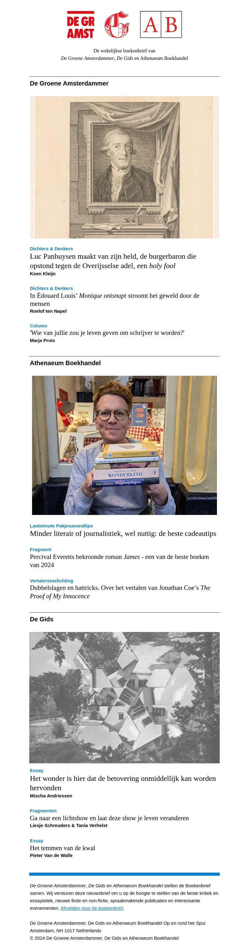 In deze uitgave van de Boekenbrief duik je in de wereld van Édouard Louis' nieuwste werken en ontdek je Luc Panhuysen's verhalen over historische figuren. Lees ook over de bekroonde roman 'James' en literaire essays die je blik verruimen. Ontvang nuttige cadeautips en literatuur die je inspireert. Mis het niet!