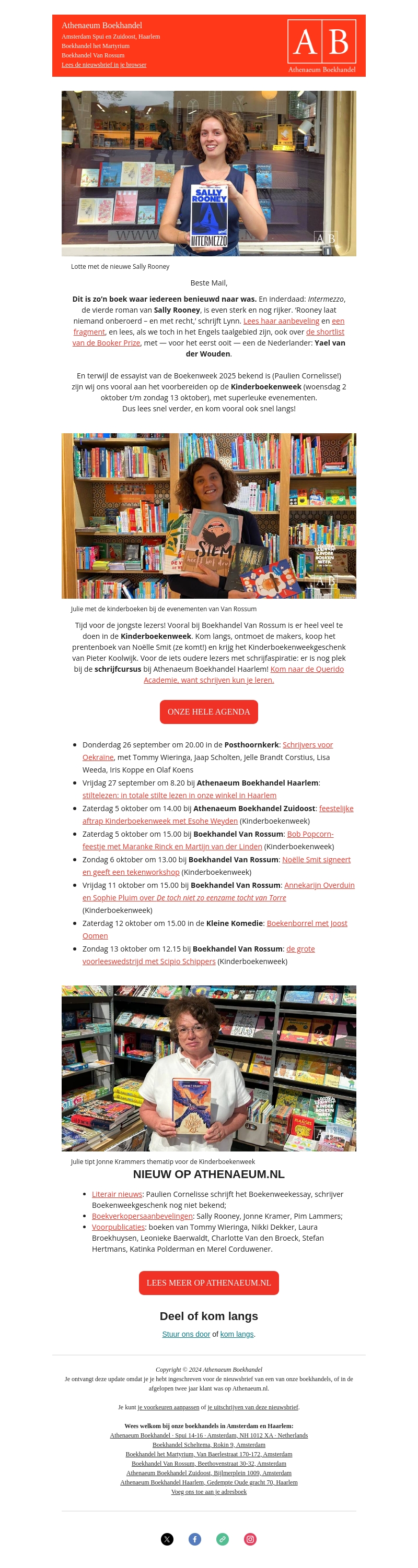 In deze nieuwsbrief introduceren we de nieuwste roman van Sally Rooney, 'Intermezzo'. Ook bereiden wij ons voor op de Kinderboekenweek met diverse activiteiten, inclusief boekpresentaties en workshops. Lees snel verder en kom langs bij onze boekhandels voor inspiratie en literair plezier!