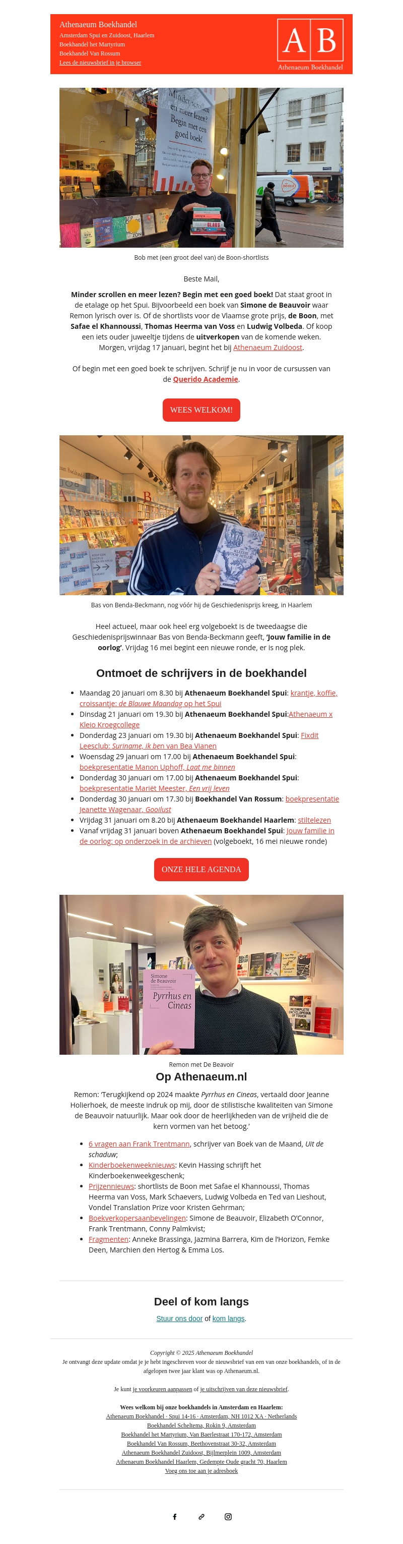 In deze nieuwsbrief van Athenaeum Boekhandel: Simone de Beauvoir's boeken, de genomineerden voor de Boon-prijs en ontmoetingen met auteurs. Ontmoet schrijvers in de boekhandel en krijg tips voor de beste boeken van de maand. Mis het niet!