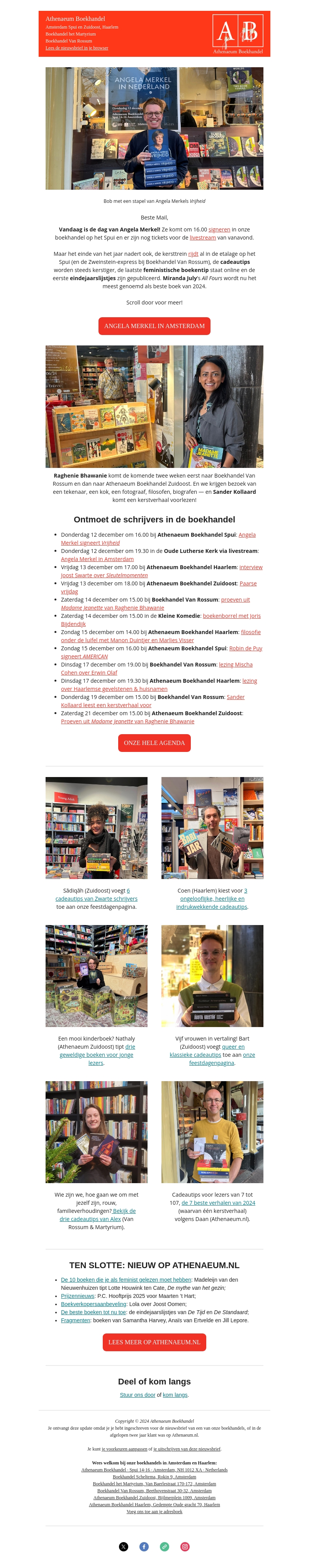 Athenaeum Boekhandel verwelkomt Angela Merkel op het Spui met haar nieuwste boek. Geniet van een feestelijke boekpresentatie en ontdek de nieuwste titels voor de feestdagen. Ontmoet schrijvers in de boekhandel en vind het perfecte cadeau voor de kerstperiode.