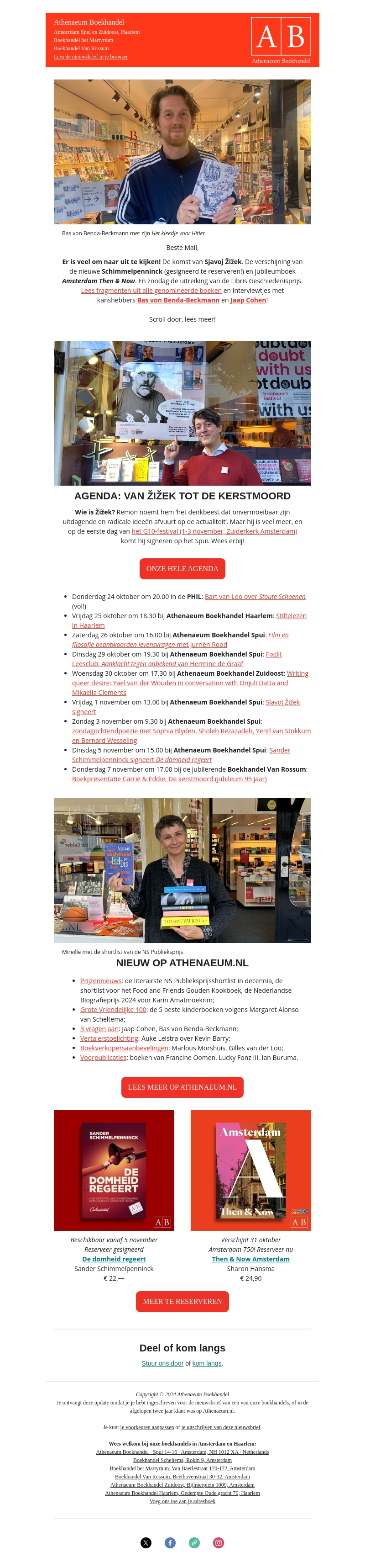 Ontdek de literaire evenementen bij Athenaeum Boekhandel. Met signeersessies van Slavoj Žižek en Sander Schimmelpenninck en nieuwe boekreleases zoals 'De domheid regeert' en 'Then & Now Amsterdam'. Bezoek ons tijdens het G10-festival en krijg een inkijkje in de laatste prijswinnende boeken en literaire nieuws.
