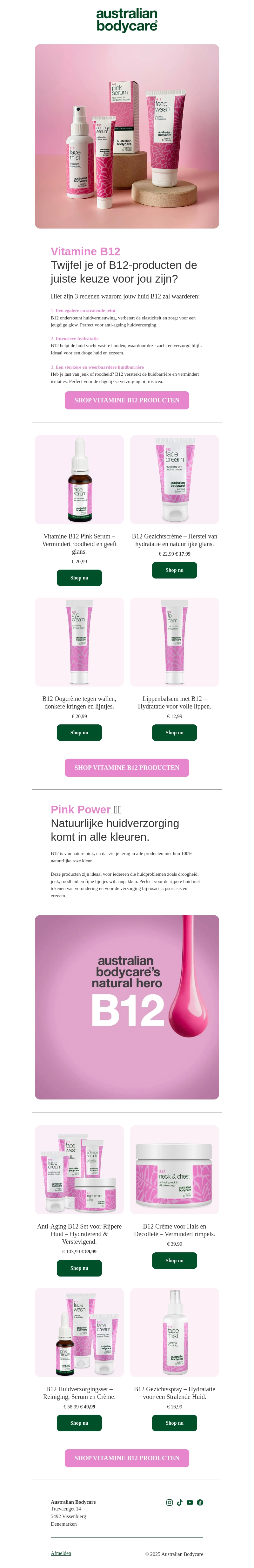 Australian Bodycare introduceert de krachtige Vitamine B12-producten. Deze lijn is speciaal ontworpen om je huid te hydrateren, te beschermen en te verjongen. Ervaar het verschil met serums, crèmes en meer, allemaal verrijkt met de natuurlijke voordelen van B12. Perfect voor een stralende en gezonde huid. Ontdek nu de voordelen van de Pink B12-lijn.
